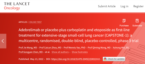 北京时间2022年5月14日,AG官网医药自主研发的PD-L1抑制剂阿得贝利单抗治疗广泛期小细胞肺癌的III期临床研究(CAPSTONE-1研究)成果正式全文在线发表于国际权威学术期刊《柳叶刀·肿瘤学》(《THE LANCET Oncology》,影响因子41.316)。CAPSTONE-1研究结果显示,阿得贝利单抗联合化疗一线治疗广泛期小细胞肺癌相较于安慰剂联合化疗可以显著延长患者总生存期至15.3个月[1],刷新现有免疫药物一线治疗广泛期小细胞肺癌的总生存纪录[2]