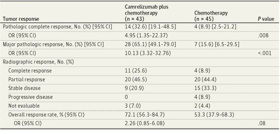 北京时间8月3日,AG官网医药创新药卡瑞利珠单抗联合化疗(Cam+CT)对比化疗(CT)新辅助治疗ⅢA/ⅢB (T3N2) 期非小细胞肺癌(NSCLC)结果在线发表于国际权威期刊JAMA Oncology[1]。该研究是由空军军医大学唐都医院姜涛教授、雷杰教授团队联合陕西省肿瘤医院雷光焰教授团队、兰州大学第二附属医院王成教授团队共同参与的一项随机对照、多中心、Ⅱ期临床研究(TD-FOREKNOW,NCT04338620)。研究结果显示,与化疗相比,卡瑞利珠单抗联合化疗新辅助治疗NSCLC显著提高了病理完全缓解(pCR)率(32.6% vs 8.9%,OR=4.95,95% CI :1.35-22.37, P =0 .008),且安全性良好。本研究是卡瑞利珠单抗新辅助治疗可切除NSCLC患者的首个随机对照研究,为NSCLC新辅助免疫治疗再添新证。