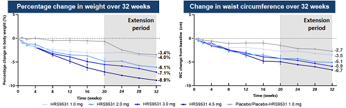 HRS9531在32周治疗期间显示出明显且持续的血糖控制和体重减轻作用,同时改善了肝脏、肾脏指标和心血管疾病风险因素,安全性与其他GLP-1RA类药物相似。
